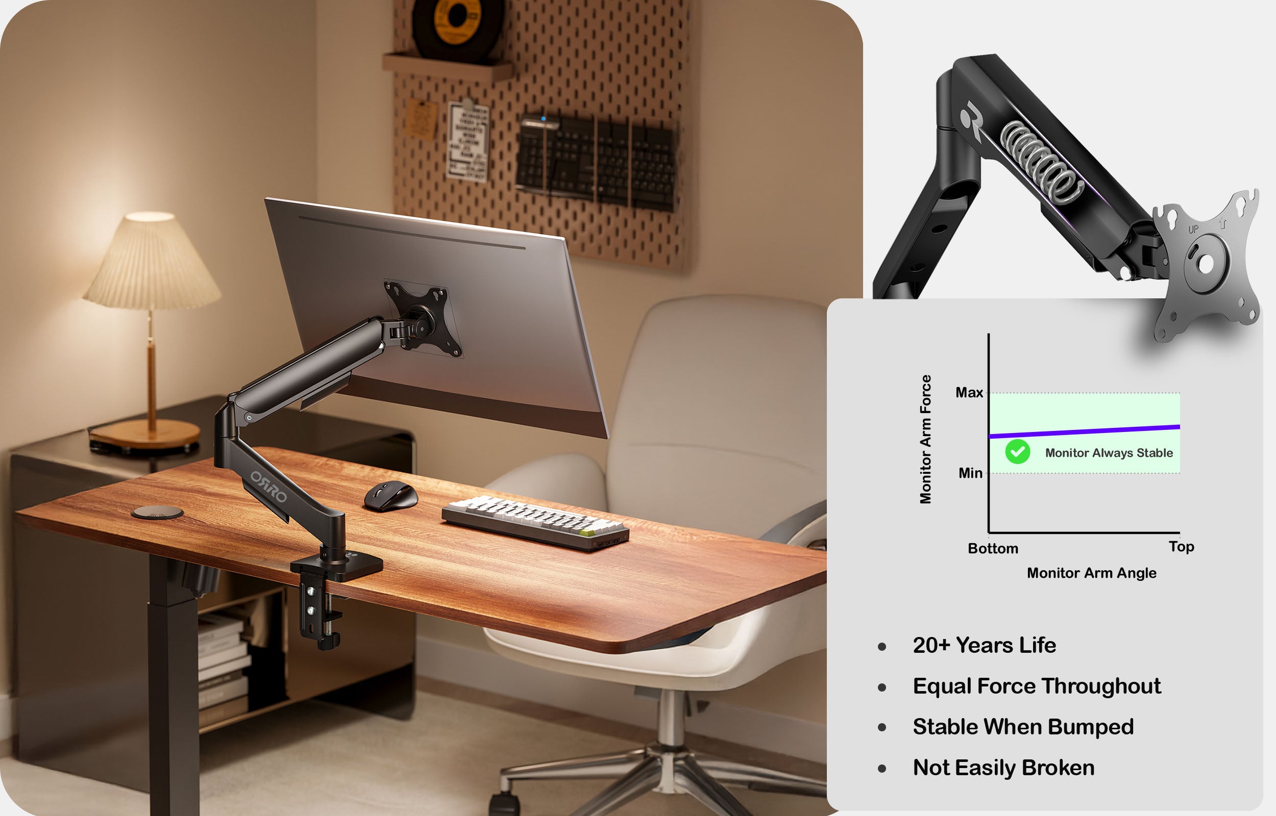 Adjust the spring tension to meet your preference, stiffness and tailor it to your monitor's weight.