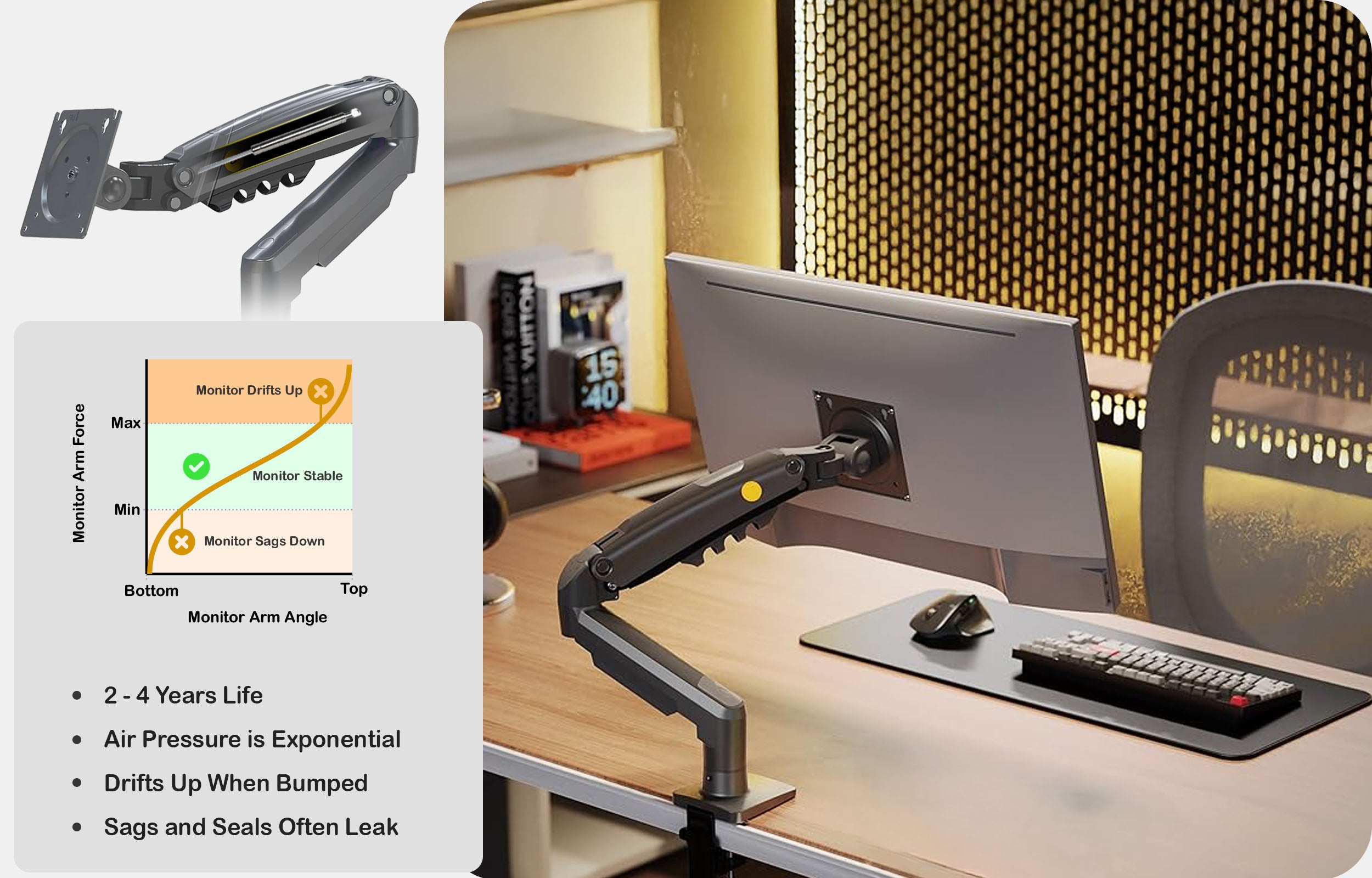 Modern mechanical spring monitor arms outlast their gas counterparts by at least 5x without any drawbacks.