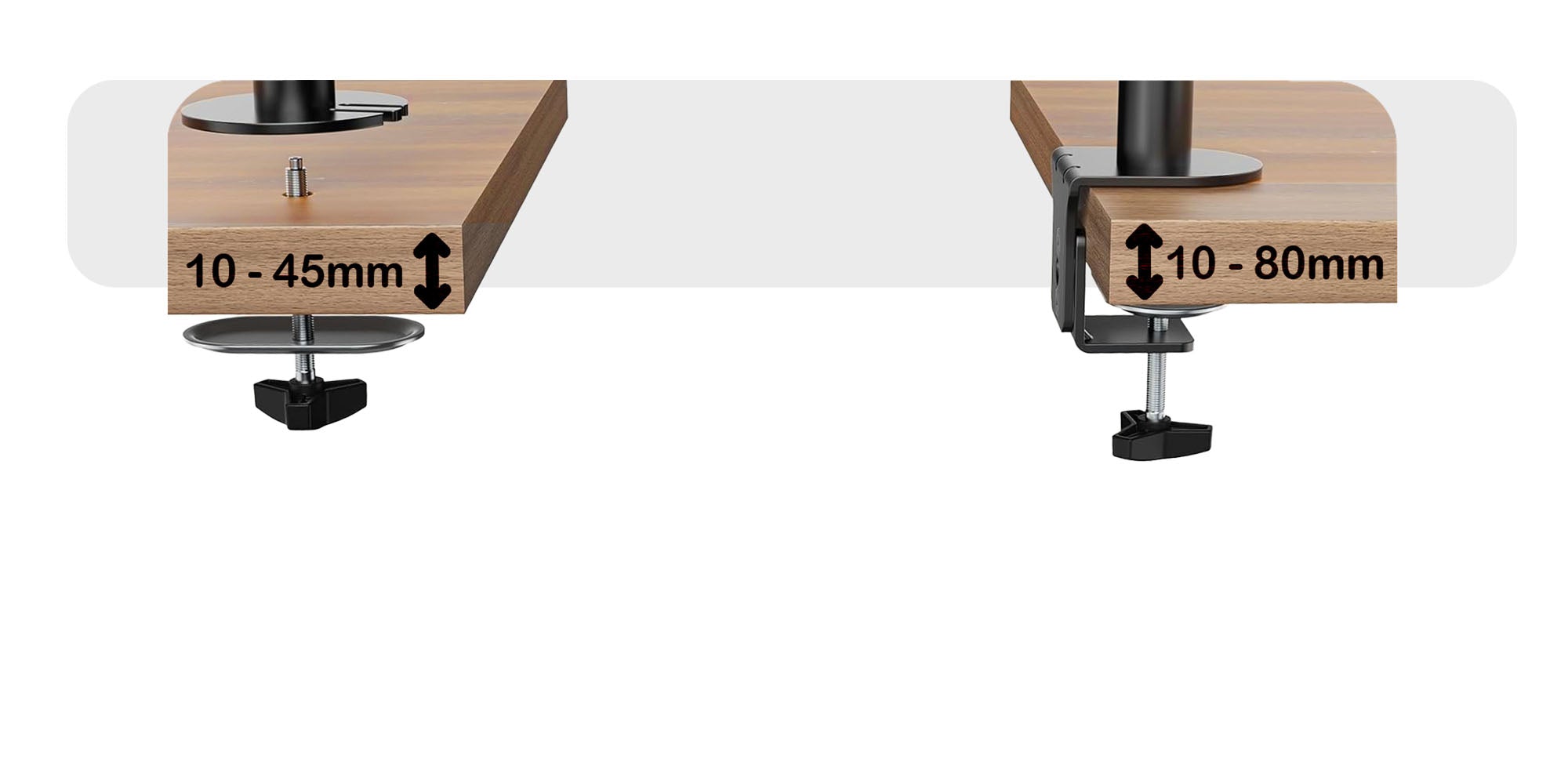 All monitor arms are equipped with two clamps allowing you to either clamp to the edge of a desk or to drill through the desk anywhere.