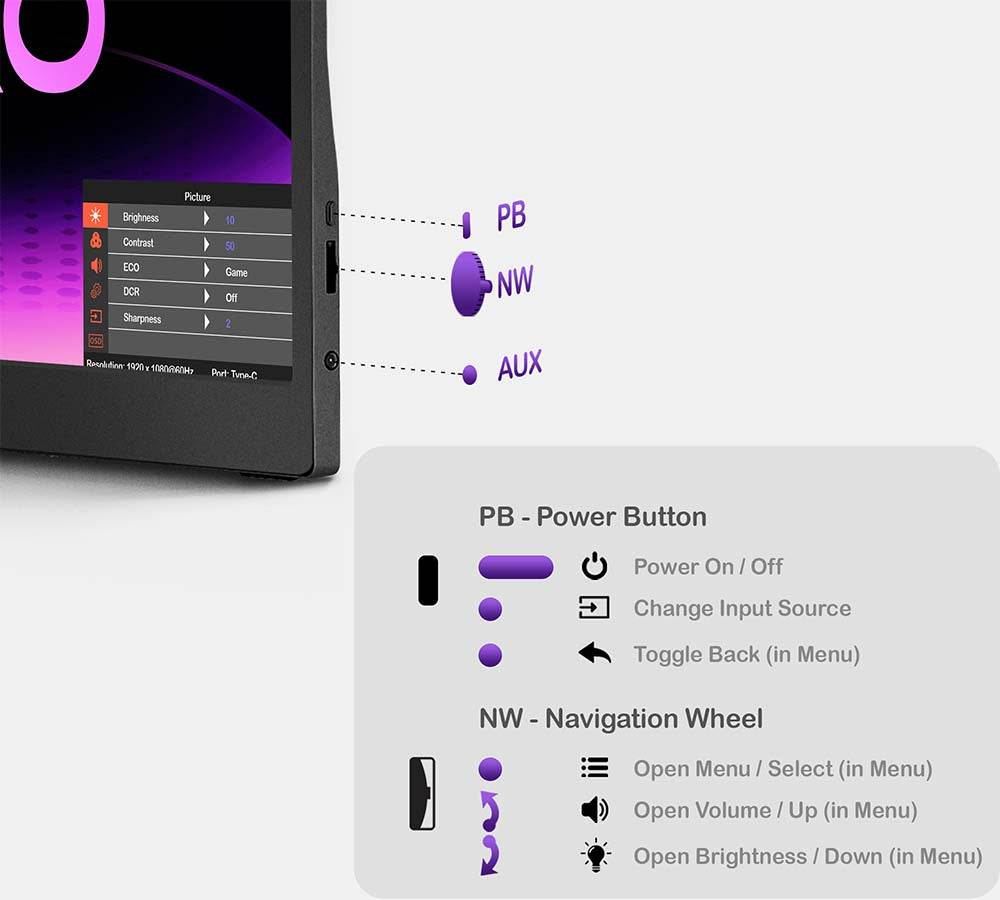 - Intuitive Controls: Quickly adjust your settings through a user-friendly interface. The side-mounted power button allows you to turn the monitor on or off, switch input sources, or navigate back in menus. The navigation wheel lets you access and modify volume or brightness settings with a simple press or scroll.