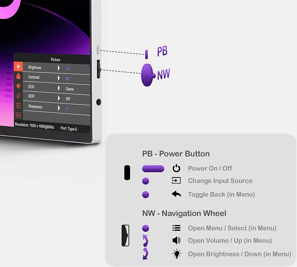 Using the built in Navigation wheel and power button, you can easily navigate the onboard settings menu.
