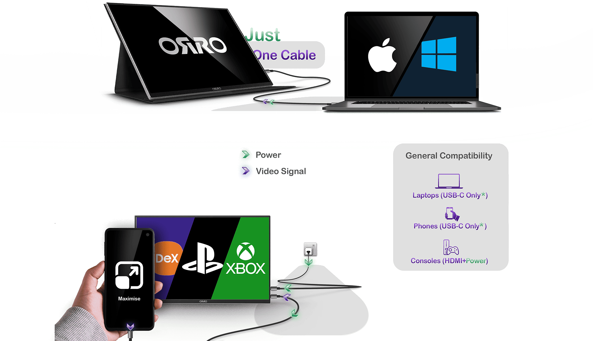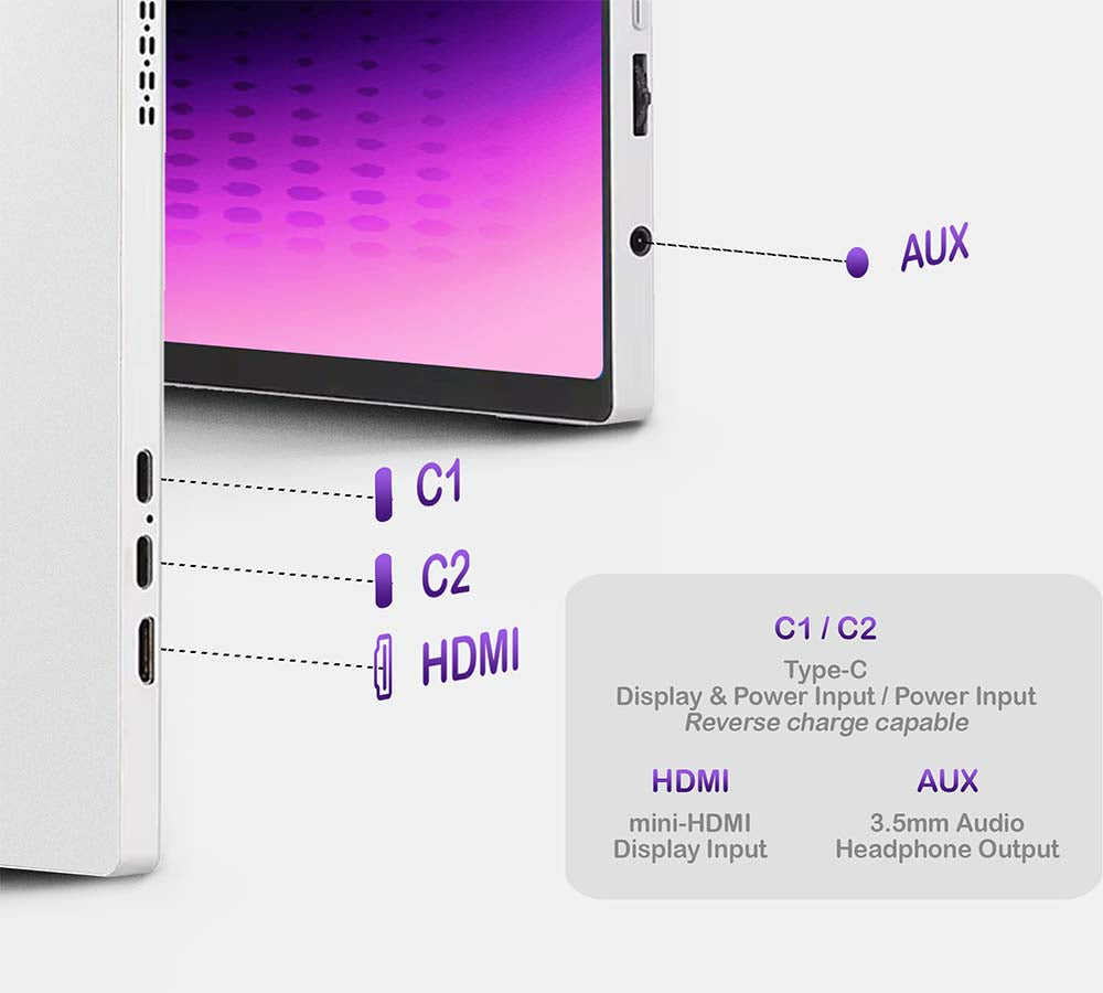 • Enjoy reverse trickle charging your device whilst you use your portable monitor.