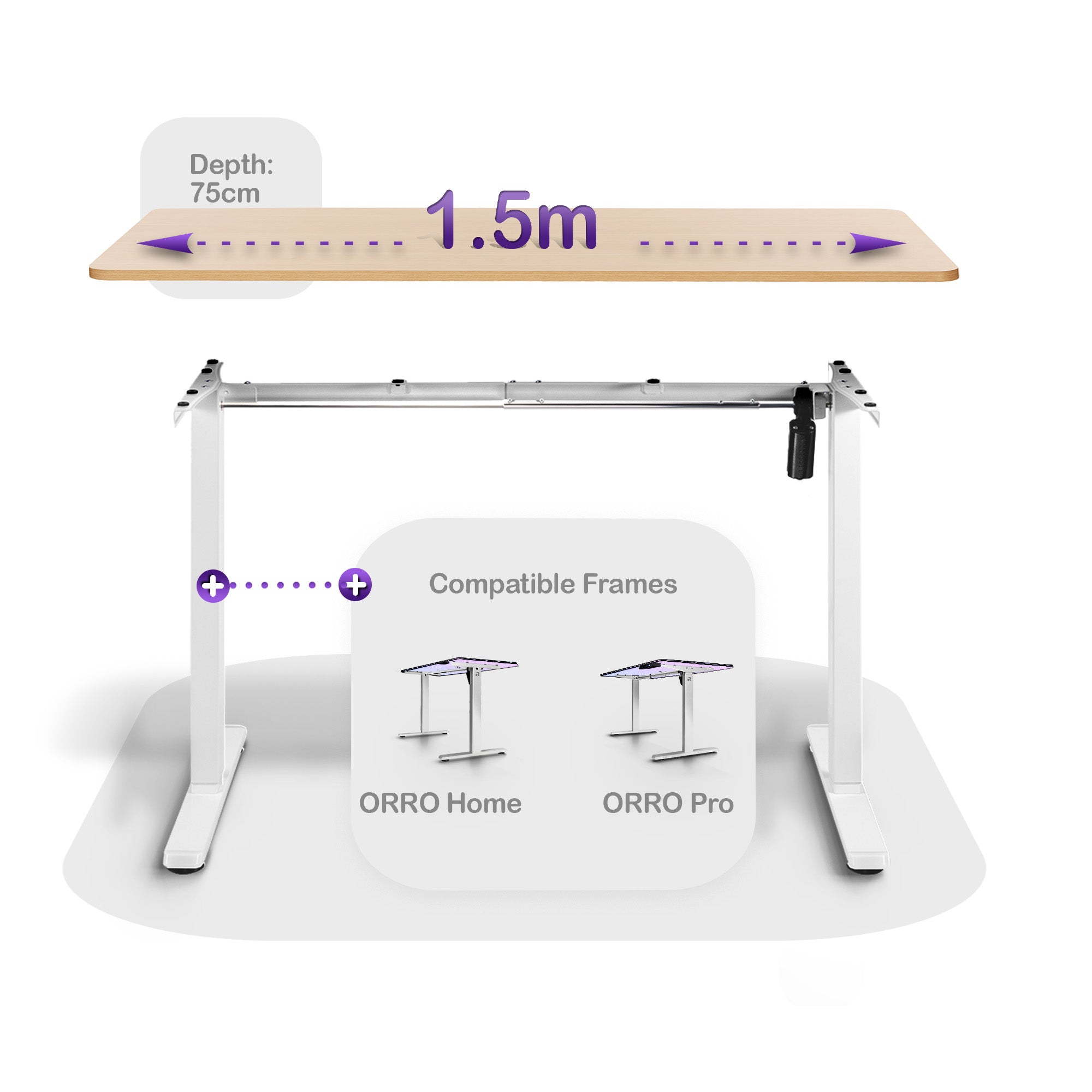 - 1.5m - Ideal for larger workspaces needing extra room (Compatible with ORRO Home and ORRO Pro Standing Desk Frames)